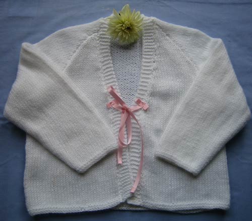 The basic DK raglan jacket with ribbon tie fastenings is a simple and useful garment for summer days.